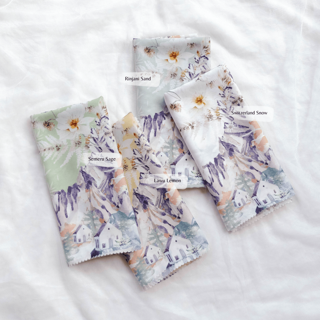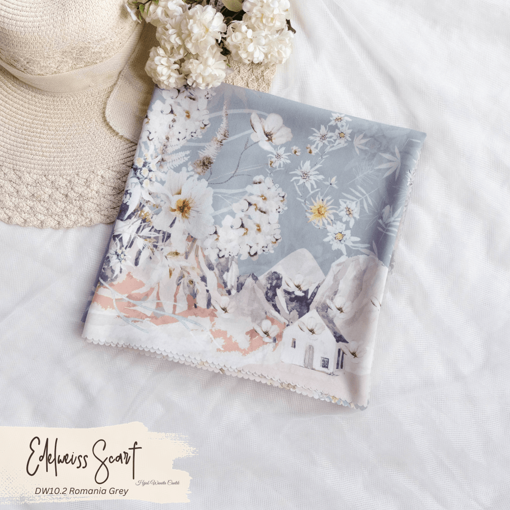Hijab segiempat premium dengan motif terinspirasi dari keindahan nuansa pegunungan dan panorama dataran tinggi dengan nuansa bunga khas yaitu bunga Edelweiss yang melambangkan kesetiaan dan keabadian. Diproduksi dengan teknologi printing watercolor style khas @hijabwanitacantik seperti lukisan mewah. Cantik dan syahdu banget ! dijamin membuat penampilan kamu makin berkesan!