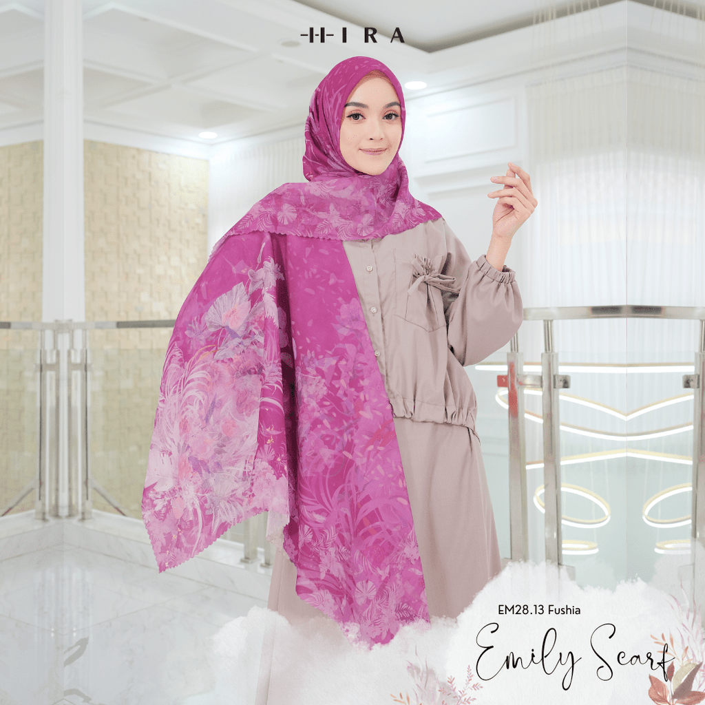 Hijab printing dengan motif exclusive Emily Series yang terinspirasi dari tema vintage garden yaitu nuansa keindahan bunga-bunga di taman dengan dekorasi klasik yang memukau. Dengan perpaduan warna-warna pastel yang lembut serta motif bunga yang sangat beragam menggambarkan rangkaian aneka bunga yang tertata cantik di taman. Pada bagian tengah scarf terdapat ornamen-ornamen abstrak dengan warna yang menyatu dengan warna dasar, sehingga memberi kesan clean dan elegan saat dipakai.