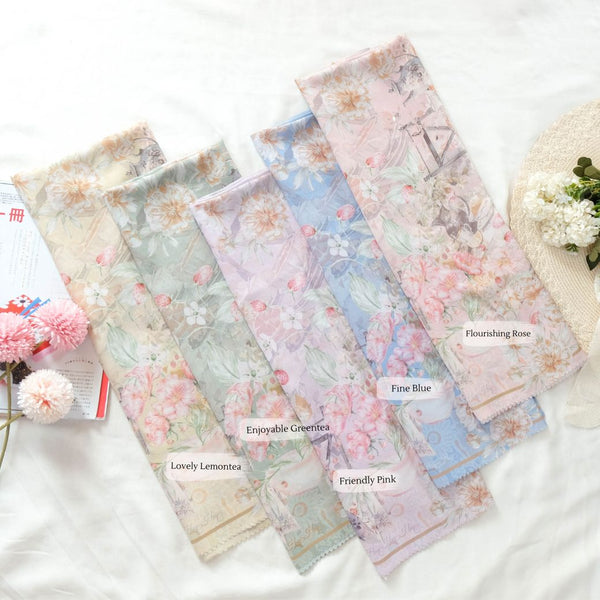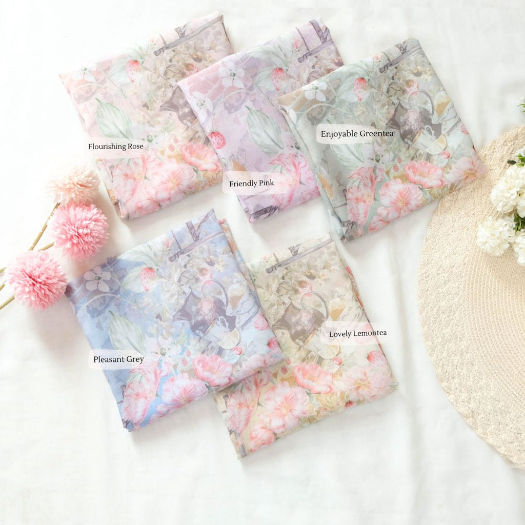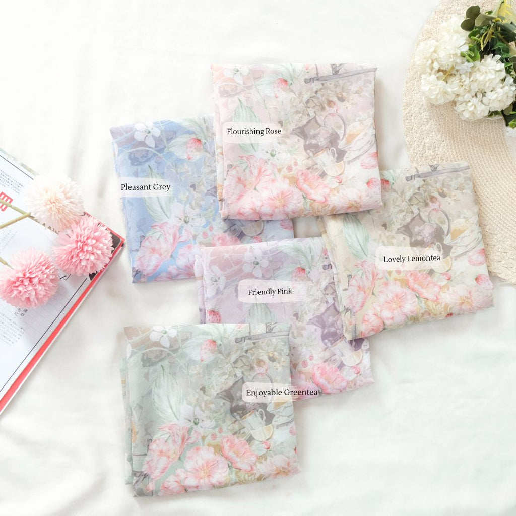 Hijab segiempat premium dengan motif yang terinspirasi dari Camellia sinensis atau tanaman teh, yang memberi nuansa kehangatan dan ketenangan. Motif bunga-bunga extra mewah dengan detail seperti lukisan! Dipadu dengan motif gelas cangkir klasik serta warna-warna yang soft memberikan penampilanmu semakin cantik & percaya diri