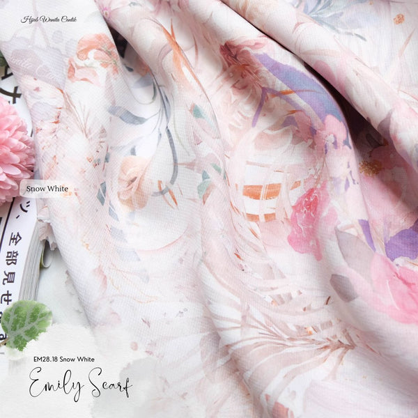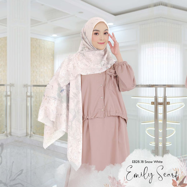 Hijab printing dengan motif exclusive Emily Series yang terinspirasi dari tema vintage garden yaitu nuansa keindahan bunga-bunga di taman dengan dekorasi klasik yang memukau. Dengan perpaduan warna-warna pastel yang lembut serta motif bunga yang sangat beragam menggambarkan rangkaian aneka bunga yang tertata cantik di taman. Pada bagian tengah scarf terdapat ornamen-ornamen abstrak dengan warna yang menyatu dengan warna dasar, sehingga memberi kesan clean dan elegan saat dipakai.
