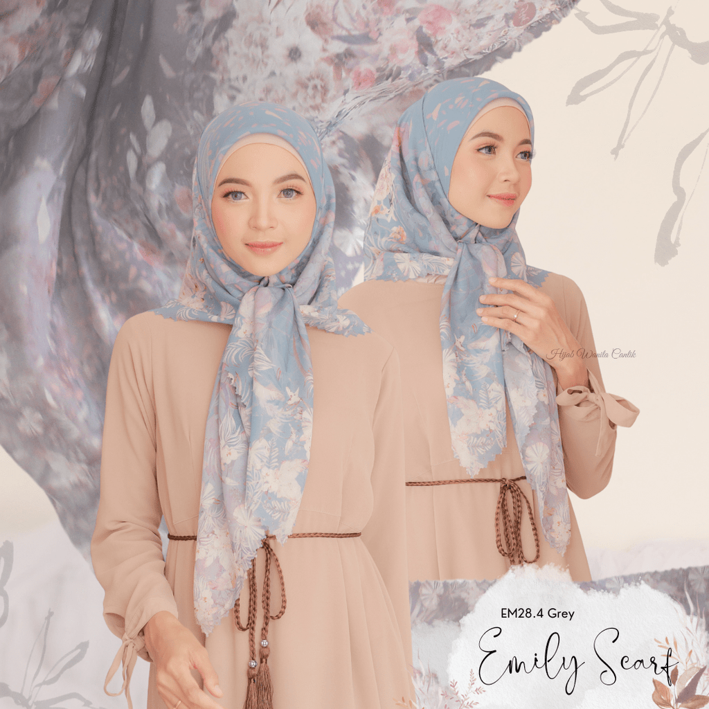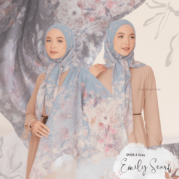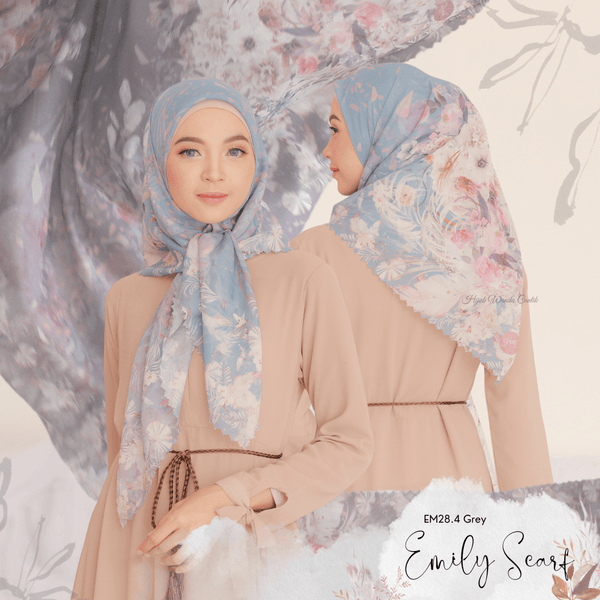 Hijab printing dengan motif exclusive Emily Series yang terinspirasi dari tema vintage garden yaitu nuansa keindahan bunga-bunga di taman dengan dekorasi klasik yang memukau. Dengan perpaduan warna-warna pastel yang lembut serta motif bunga yang sangat beragam menggambarkan rangkaian aneka bunga yang tertata cantik di taman. Pada bagian tengah scarf terdapat ornamen-ornamen abstrak dengan warna yang menyatu dengan warna dasar, sehingga memberi kesan clean dan elegan saat dipakai.