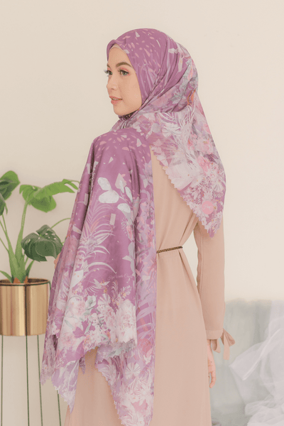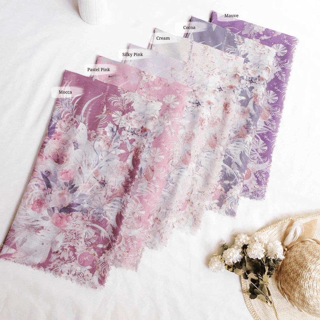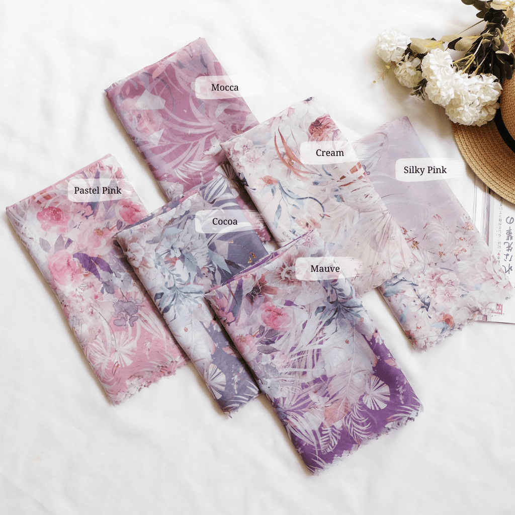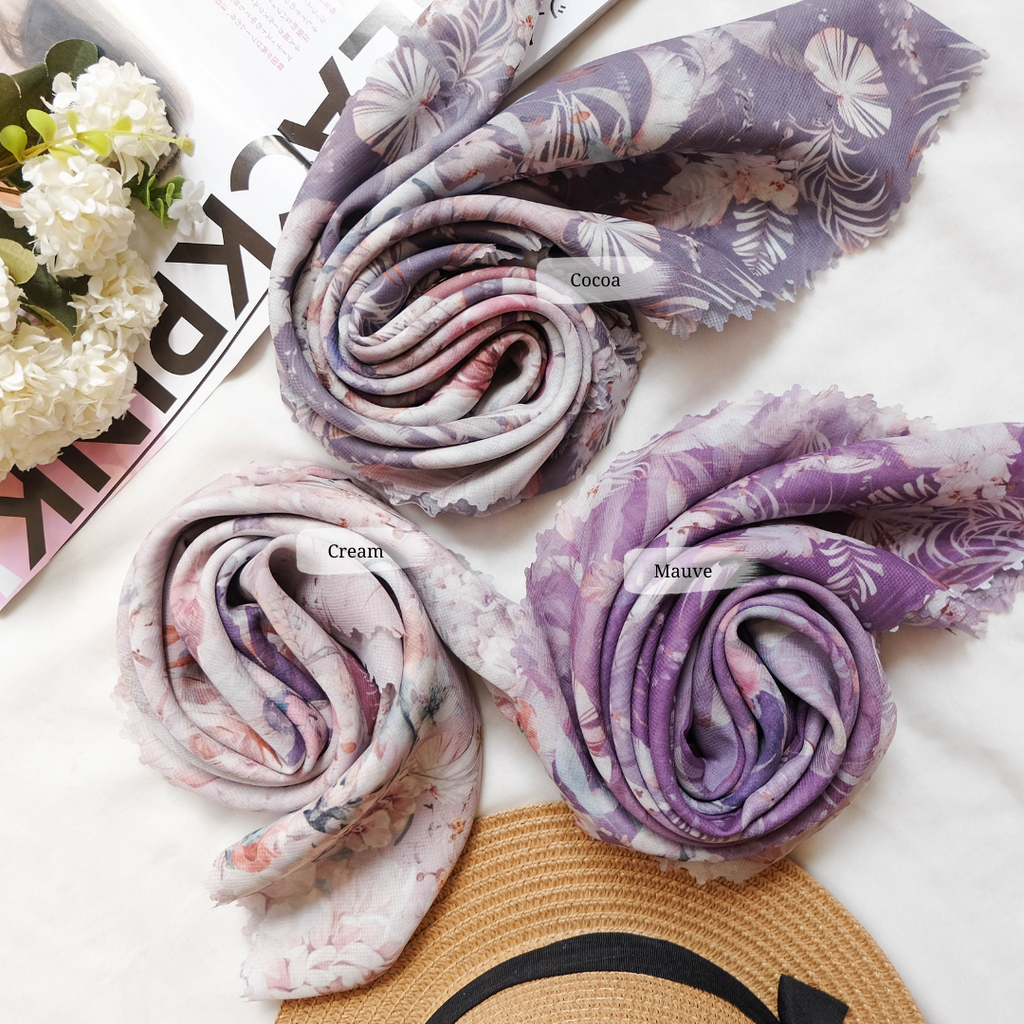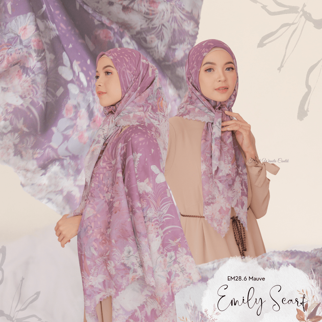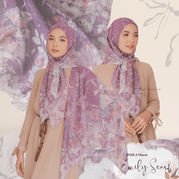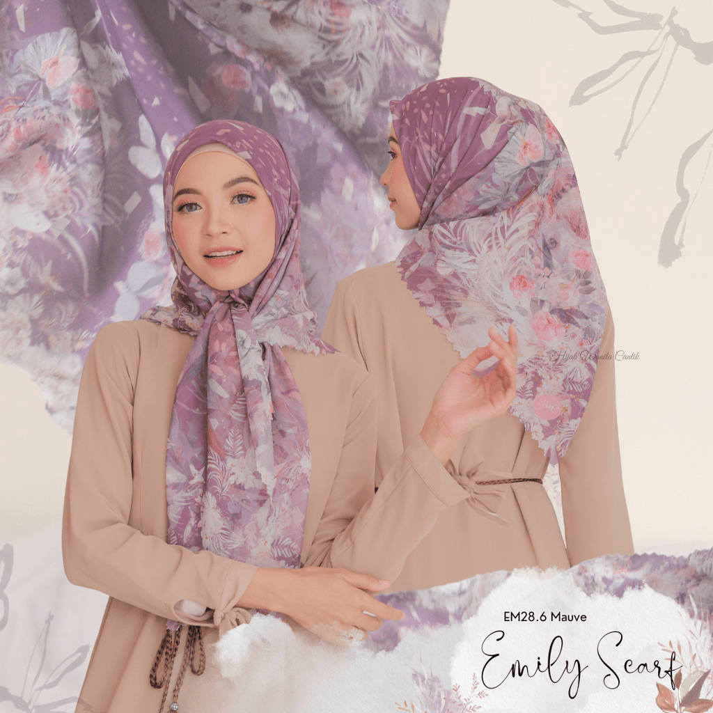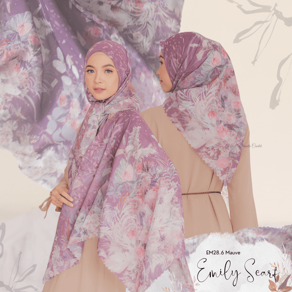 Hijab printing dengan motif exclusive Emily Series yang terinspirasi dari tema vintage garden yaitu nuansa keindahan bunga-bunga di taman dengan dekorasi klasik yang memukau. Dengan perpaduan warna-warna pastel yang lembut serta motif bunga yang sangat beragam menggambarkan rangkaian aneka bunga yang tertata cantik di taman. Pada bagian tengah scarf terdapat ornamen-ornamen abstrak dengan warna yang menyatu dengan warna dasar, sehingga memberi kesan clean dan elegan saat dipakai.