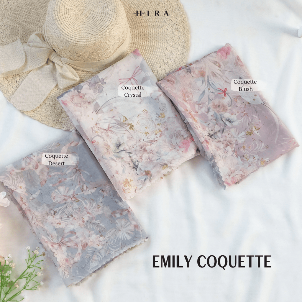 Emily series kini hadir dengan pattern signature monogram Hira. Hijab printing dengan motif exclusive yang terinspirasi dari tema vintage garden yaitu nuansa keindahan bunga-bunga di taman dengan dekorasi klasik yang memukau dipadu dengan pita coquette yang trendy. Pada bagian tengah scarf terdapat monogram logo Hira, sangat elegan dan timeless.