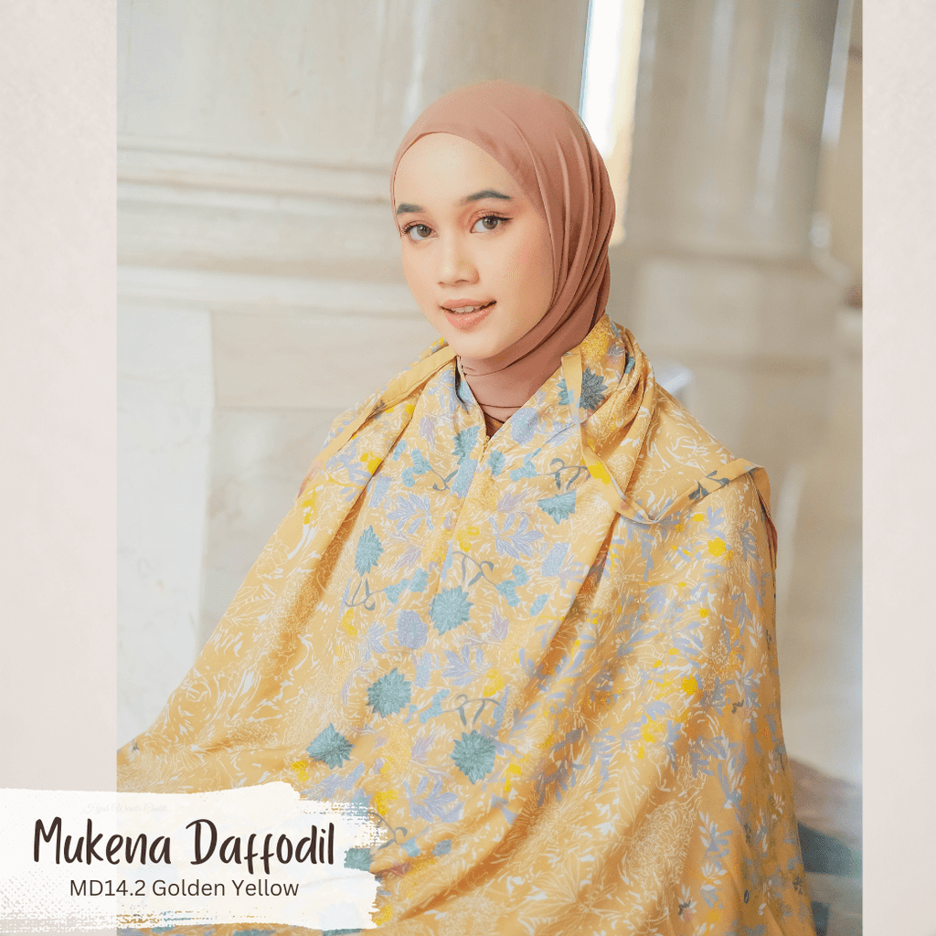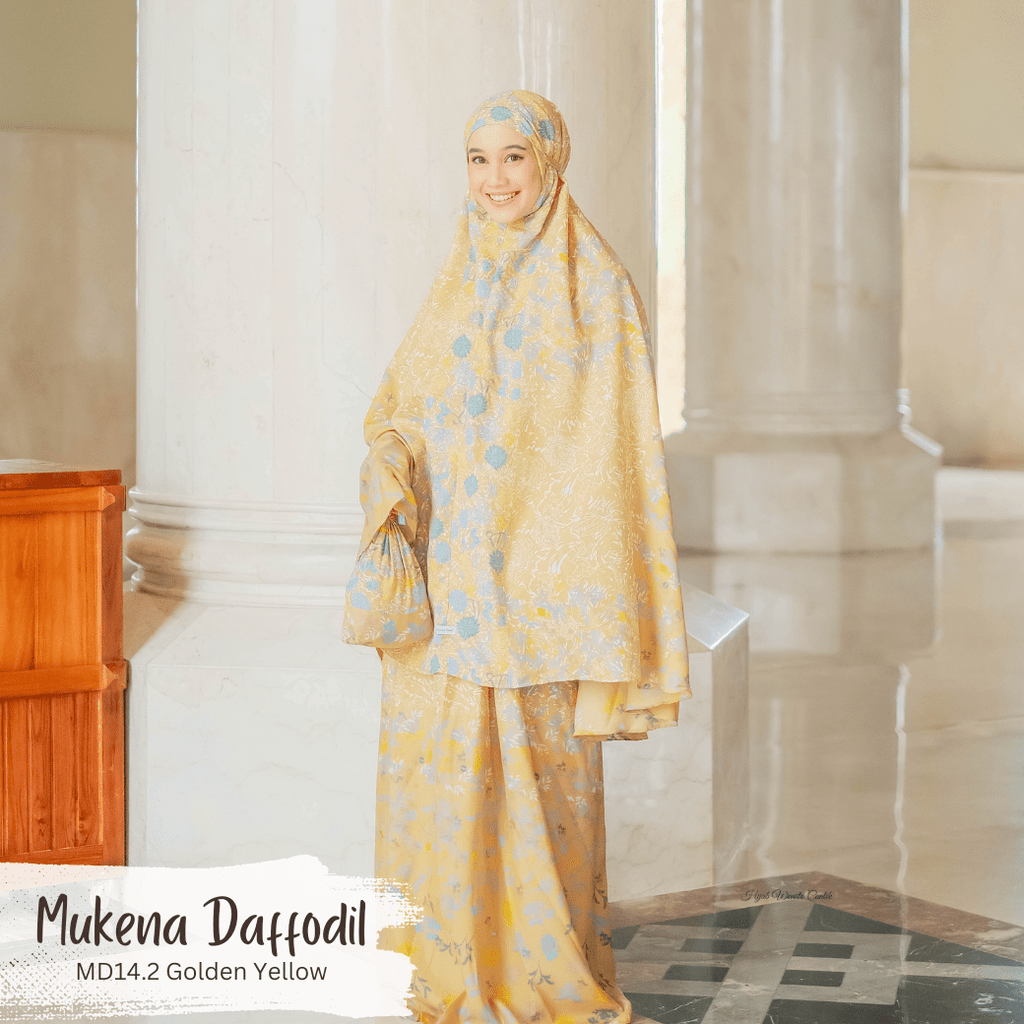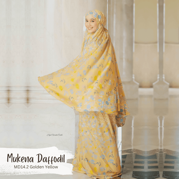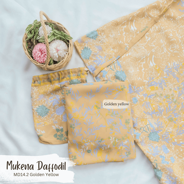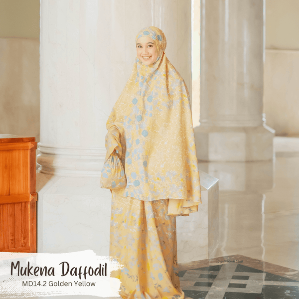 Mukena silk dengan motif super cantik yang terinspirasi dari bunga daffodil dipadu dengan ornamen bunga yang elegan. Warna cerah dan bentuk yang elegan memberikan kesan kegembiraan. Dijamin membuat hari-harimu semakin manis dan penuh kegembiraan!