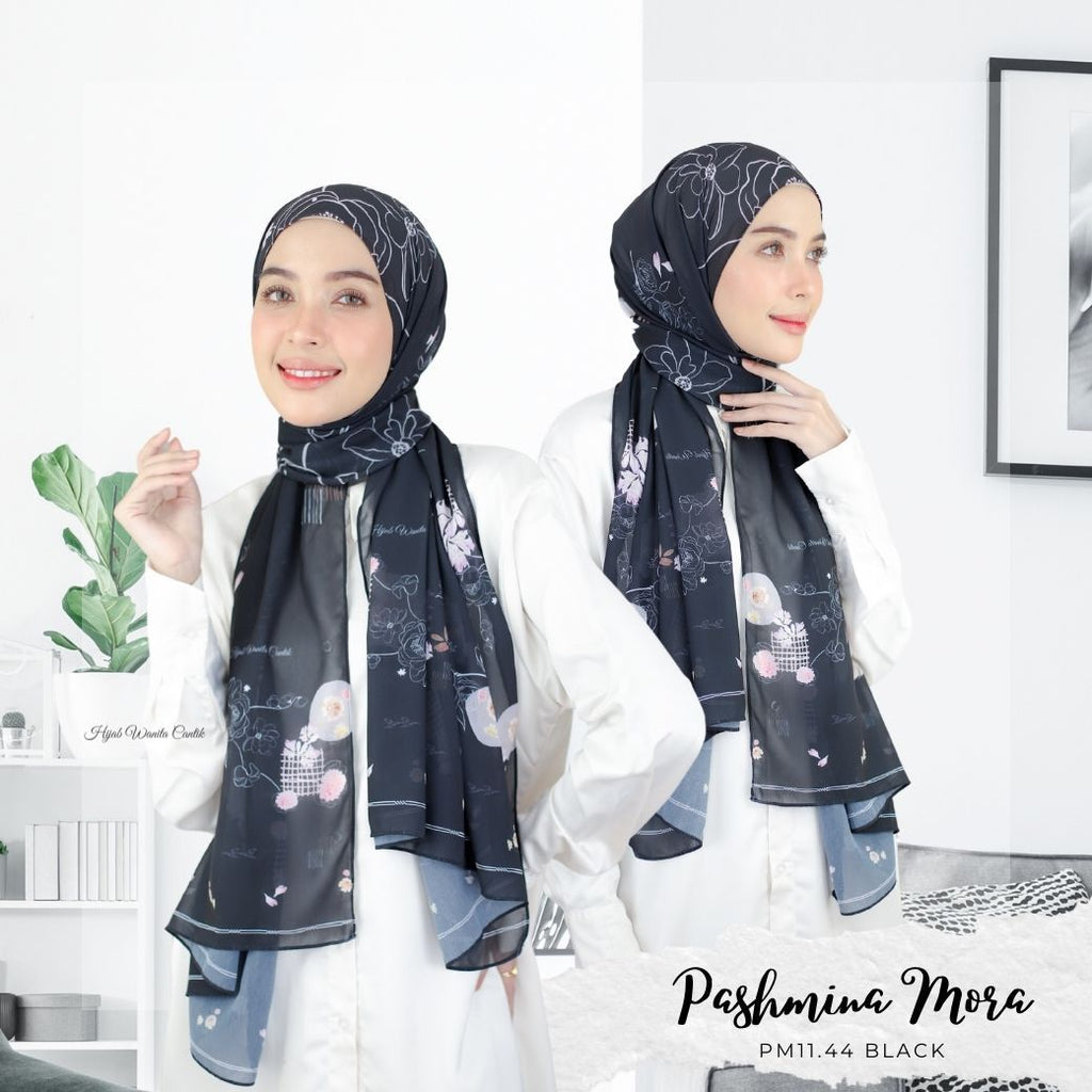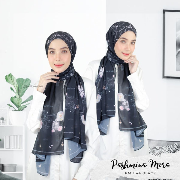 Hijab printing dengan motif Mora Series yang berarti manis, terinspirasi dari manis dan lembutnya cotton candy. Motif bunga-bunga berbentuk cotton candy memberi kesan manis, serta dipadu dengan ornamen bunga yang elegan.